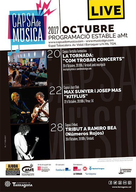 Fidel a l’esperit que la Capsa de Música és més que una sala de concerts, aquest mes d’octubre acull un festival de tribut a Ramiro Bea, component de la banda tarragonina Números Rojos traspassat fa dos anys. La programació del mes es completa amb una jornada formativa amb La Tornada i la visita de dos grans del jazz-rock català: Max Sunyer i Kitflus.