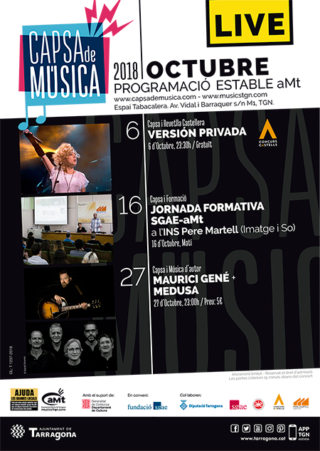 Aquest Octubre hem preparat una sèrie d’accions musicals i formatives de màxim interès. Arranquem celebrant el XXVII Concurs de Castells amb una revetlla amb la banda de versions Versión Privada; renovarem en un nou cicle formatiu, el nostre compromís amb els Instituts com ara l’INS Pere Martell d’Imatge i So amb una jornada pels alumnes sobre Drets d’autor i propietat intel·lectual i el nostre projecte pel col·lectiu de músics i acabarem a una nova cita del nostre Capsa i autor, amb la nova formació de Kandi Alvarez, Medusa, i el músic i soci de l’aMt Maurici Gené, recentment guardonat amb un premi a Manila per la seva música.