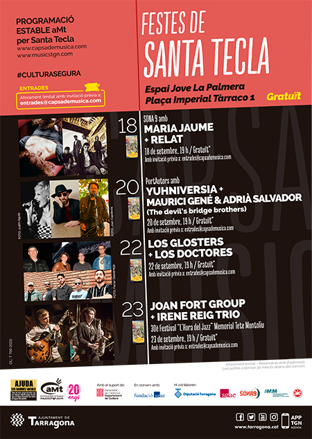L’Associació de Músics de Tarragona programa un cicle de quatre concerts durant les festes de Santa Tecla que combinen el talent emergent, noms veterans, jazz i cançó d’autor i que, excepcionalment, es faran a l’Espai Jove La Palmera de l’ajuntament de Tarragona. Això ha estat possible gràcies a l’acord i coordinació amb diversos departaments de l’ajuntament i considerant que en les actuals circumstàncies sanitàries era millor opció que una sala d’interior com és la Capsa de Música. Els quatre concerts, amb dos artistes cadascun i aforament limitat, arrencaran a les set de la tarda, seran gratuïts amb reserva prèvia al correu entrades@capsademusica.com Les portes de l’Espai Jove La Palmera (Plaça Imperial Tàrraco 1) s’obriran al públic 30 minuts abans de l’inici dels concerts.