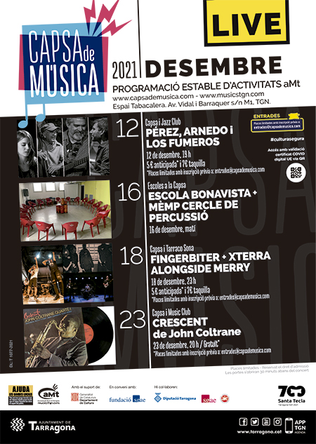 La Capsa de Música és també la casa dels músics joves de la ciutat. Aquest mes de desembre tenim una nou Tarraco Sona amb tres formacions locals emergents: Fingerbiter, XTerra i Alongside Merry. A més, tenim el millor jazz amb la família FUMERO -filla i pare- en un quartet imperdible. I com que el nostre concepte va més enllà d’una sala de concerts també organitzem un nou Escoles a la Capsa amb el CEIP Bonavista i la segona edició del nou cicle dedicat a l’audició de discos històrics, aquest cop protagonitzada per John Coltrane.