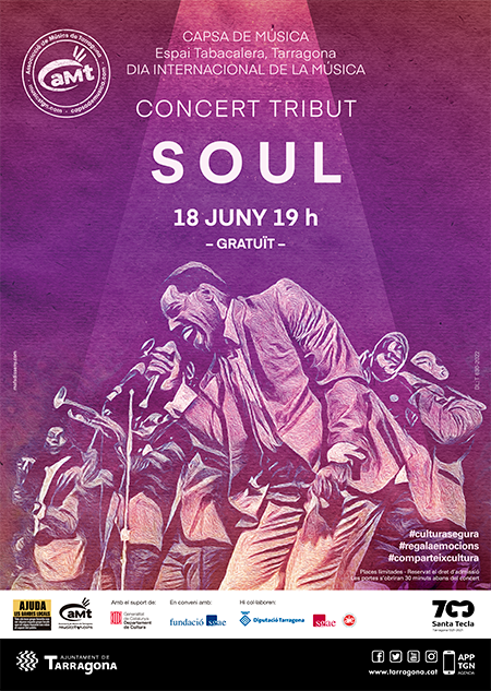 L’Associació de Músics de Tarragona (aMt) celebra aquest dissabte el Dia de la Música amb un concert-tribut a la música soul, al llarg del qual sonaran algunes de les cançons més destacades de la música negra dels anys 60 i 70 del segle passat. El concert serà a les 19:00 a la Capsa de Música i l’entrada és lliure per a tots els assistents. En el tribut hi participaran quatre formacions diferents (Onniria, 2UT, The Eightballs i Frank O’Lee Sons), a més de diversos músics i cantants convidats i, com és habitual, el final de festa amb l’aMt All Stars, és a dir, una formació creada ad hoc per al concert. Tots ells interpretaran temes d’artistes com Marvin Gaye, Otis Redding, Aretha Franklin, Curtis Mayfield o Sam Cooke.